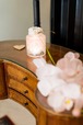 付属のライトを瓶の底面のくぼんだ部分に仕込み、ライトアップすることで、内側から溢れる光が花びらや葉の葉脈を一層引き立てます。LEDライトはボタン電池で交換可能です。